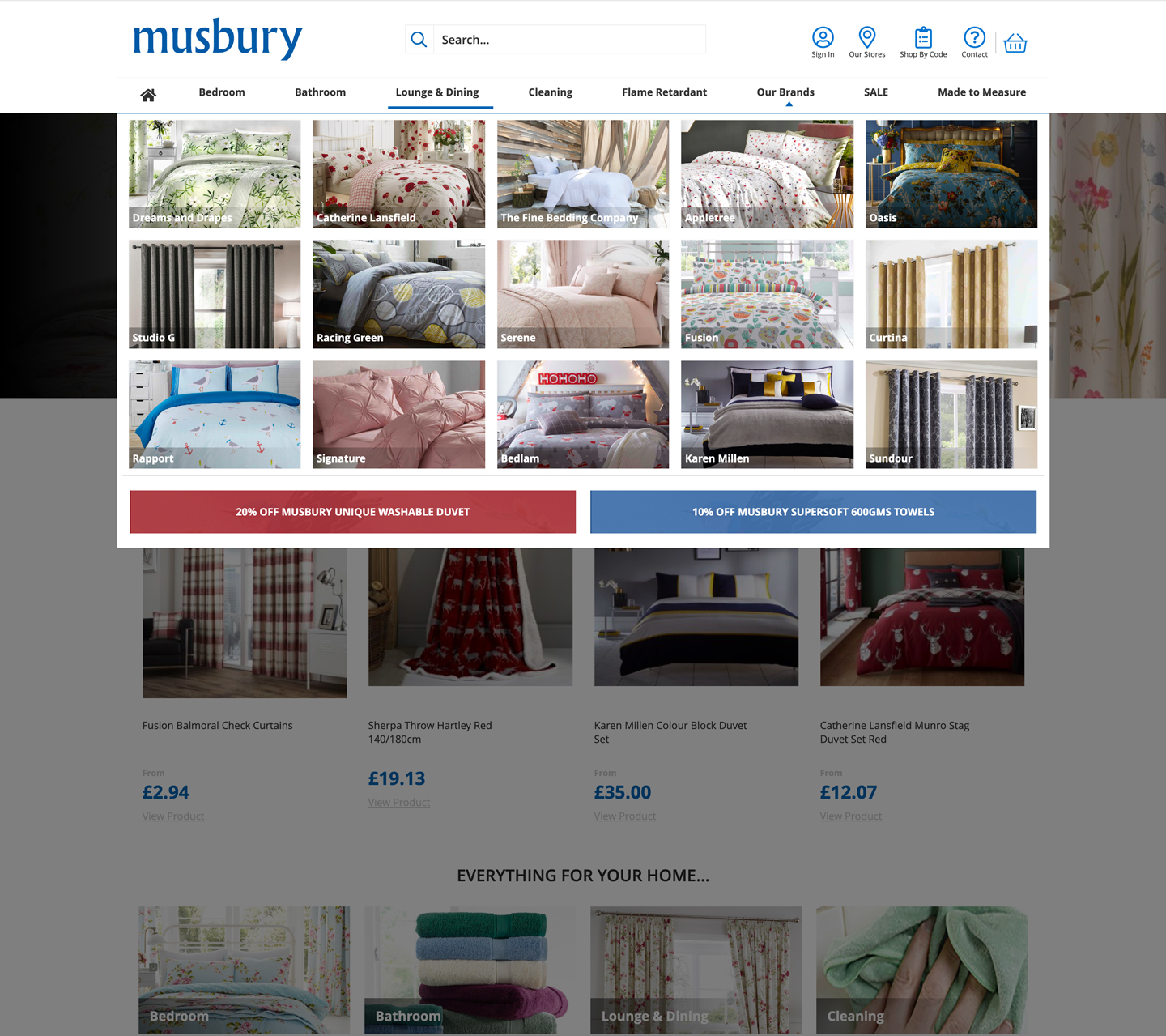 The end result of this project was a huge success. The design phase of the project allowed us time to perfect the navigation and styling to ensure the user journey was as easy and enjoyable as possible. After research into the industry we decided to go for a mega menu tile style to handle all the categories and sub-categories, which allows a lot of items to be visible in a way that isn’t just a standard drop-down list and makes use of the nice imagery that Musbury have for their products.